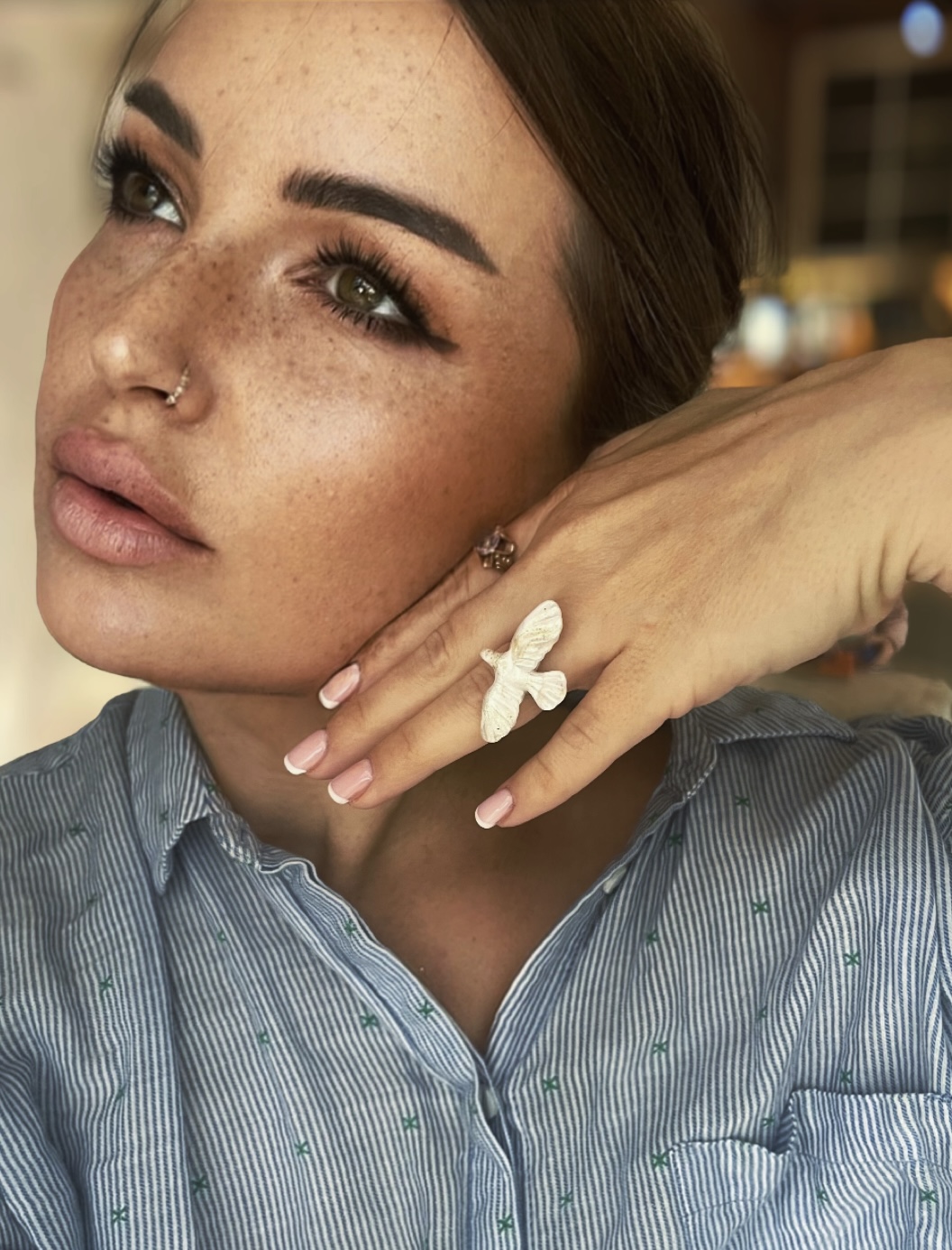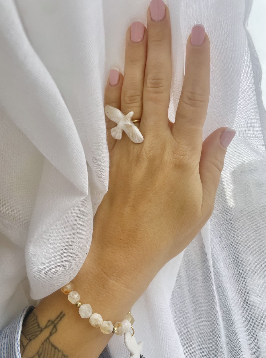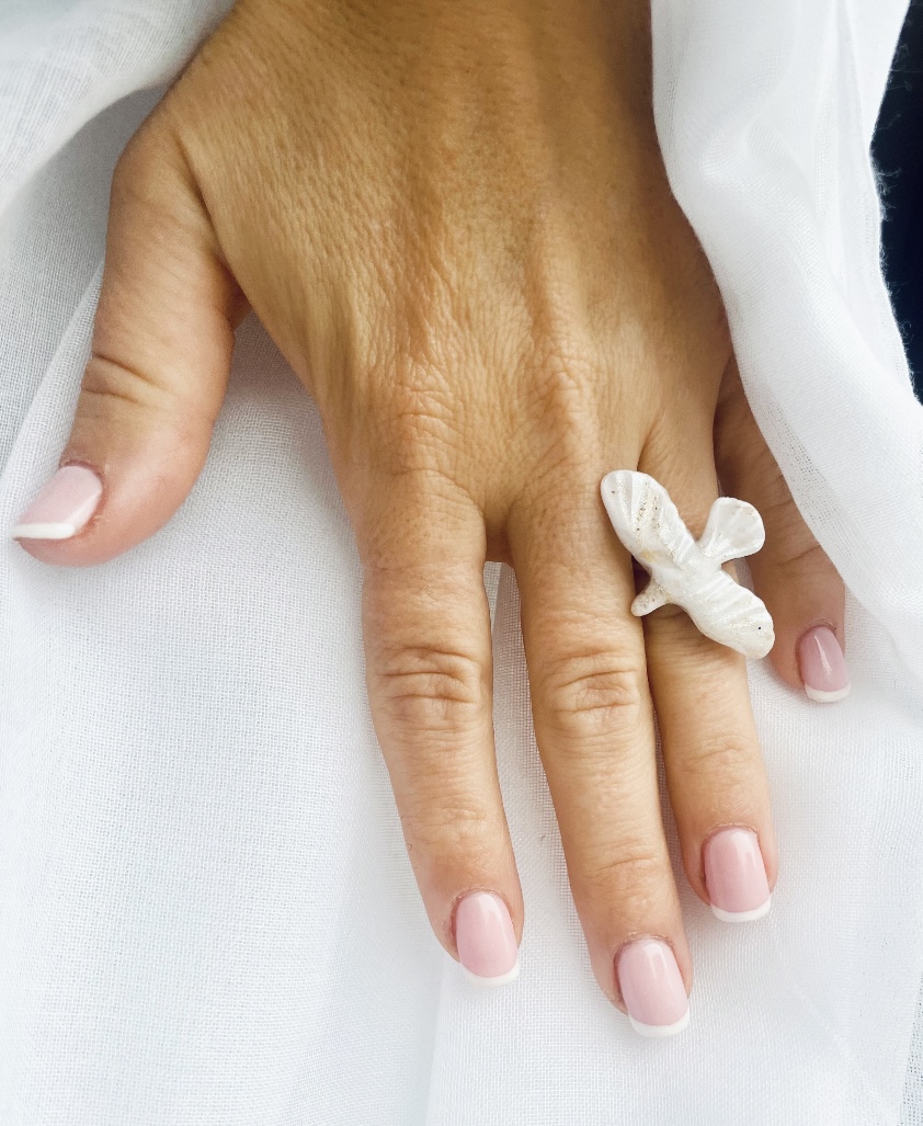 Delikatny i pełen uroku pierścionek, którego sercem jest ręcznie modelowany ptak z gliny polimerowej. Każde pióro, linia i odcień zostały stworzone z czułością, dzięki czemu figurka emanuje lekkością i subtelną magią.